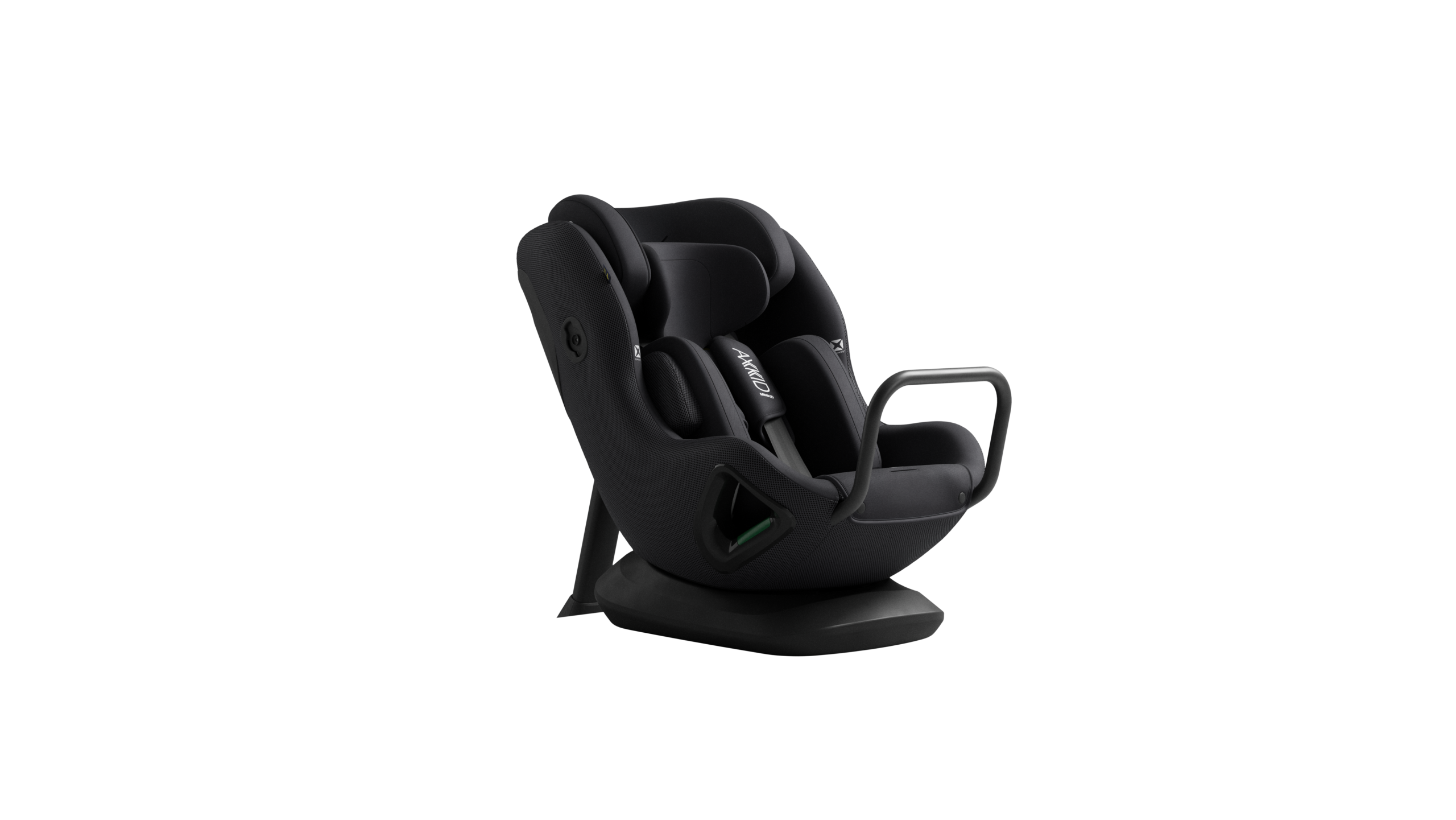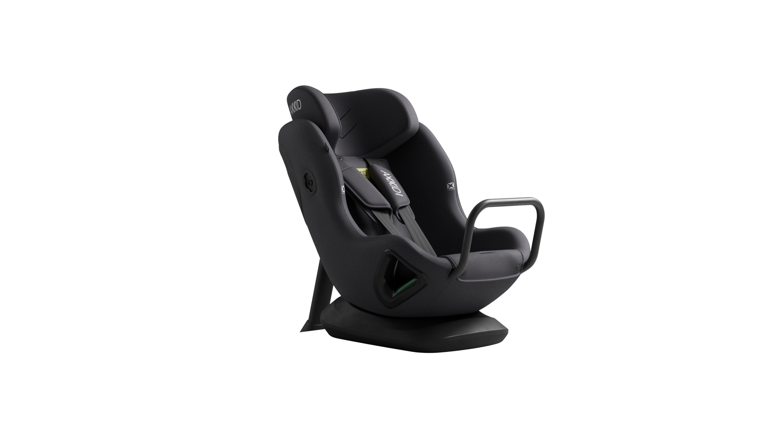 Unik stol eftersom den monteras utan underförankringsband, så enbart med bilbälte, antirotationsbygel och stödben till hela 28kg och 125cm.